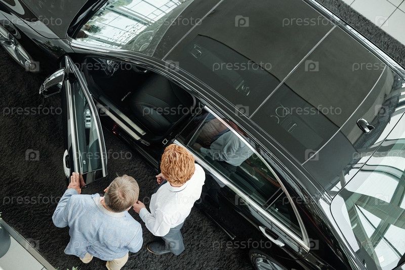 Вид молодого продавца автоцентра, показывающего интерьер автомобиля зрелому клиенту-мужчине