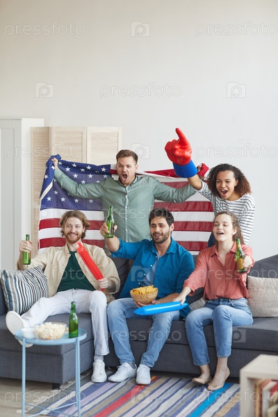 Мультиэтническая группа фанатов, смотрящих спорт по телевизору