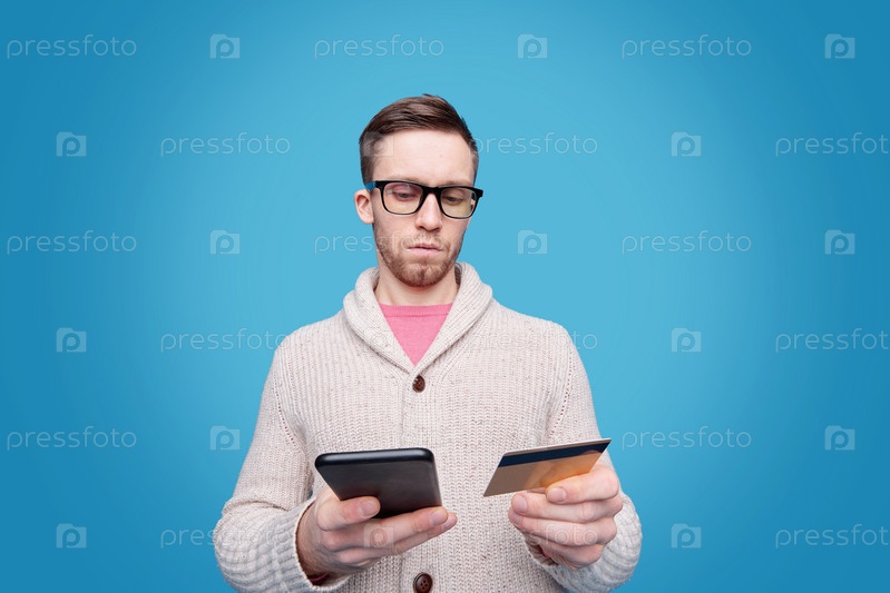 Молодой бизнесмен в очках использует смартфон, делая онлайн-заказ