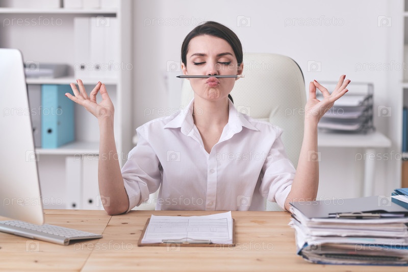 Молодая женщина-менеджер офиса или секретарь, практикующая йогу по месту работы