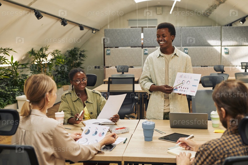 Молодой афроамериканский мужчина дает отчет на деловой встрече