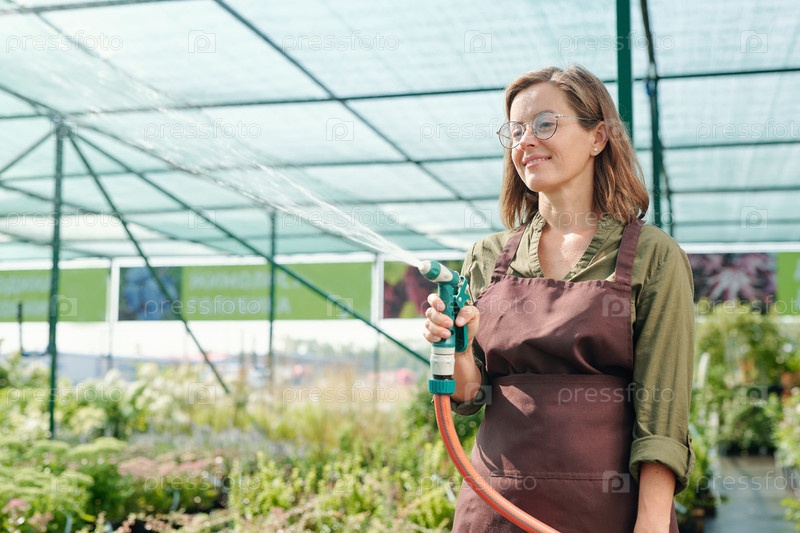 Счастливая садовница в очках и коричневом фартуке полив растений в теплице