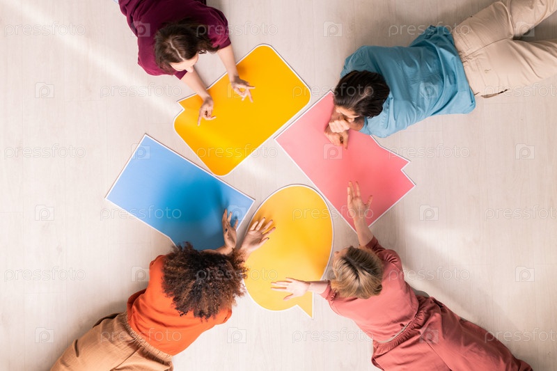 Вид сверху молодых женщин и мужчины, лежащих на полу с бумажными пузырями речи