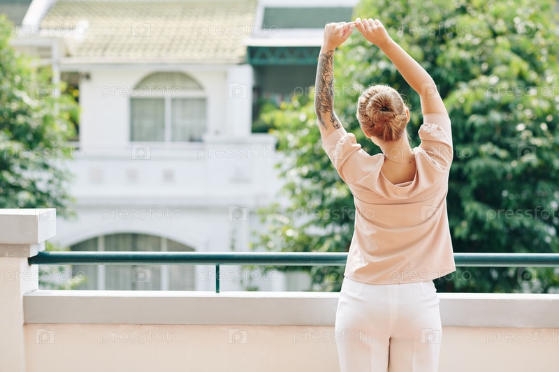 На балконе задним видом женщина