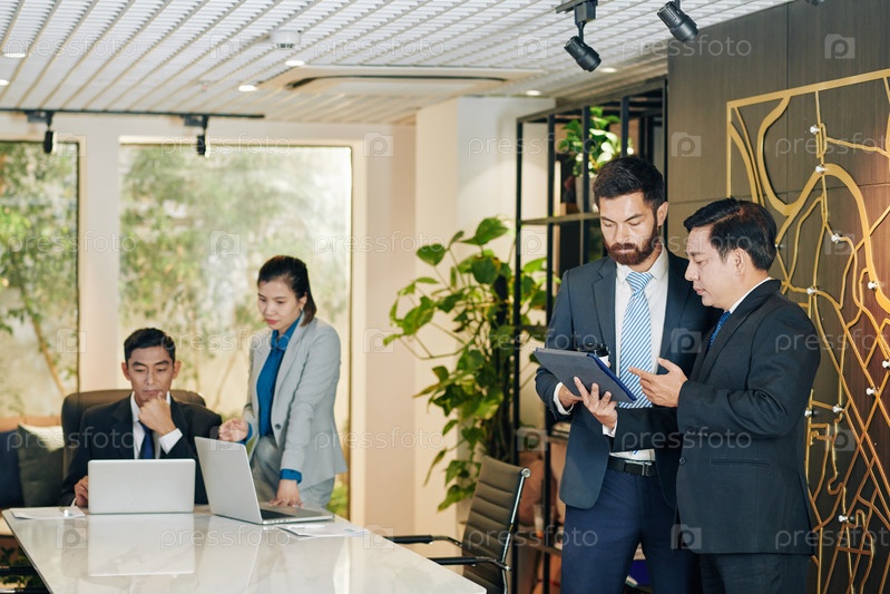 Бизнесмены обсуждают график на экране планшета