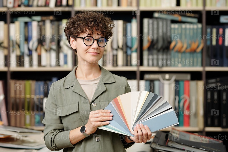 Серьезный молодой менеджер студии дизайна интерьеров, показывающий образцы кожи