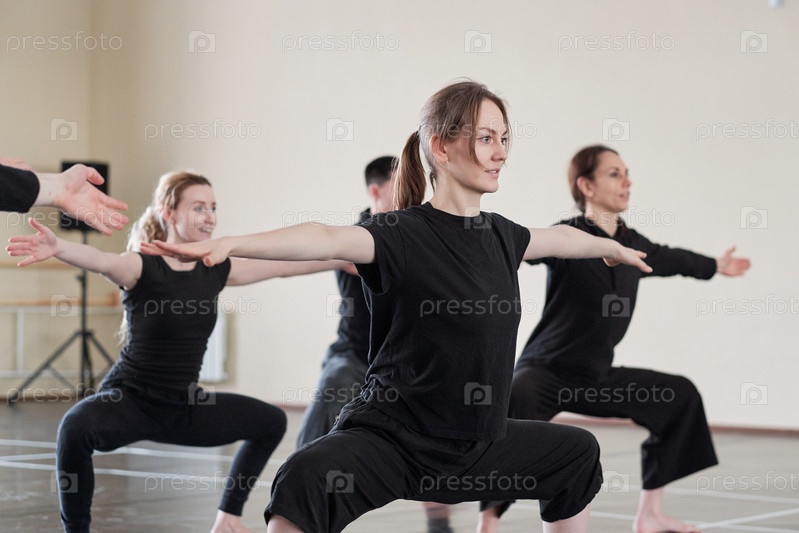 Красивый инструктор по танцам с распростертыми руками, показывающий ученикам упражнения