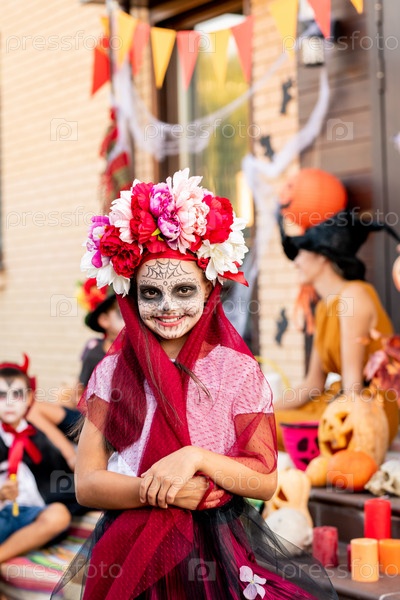 Веселая девушка с покрашенным лицом смотрит на тебя, улыбаясь своим друзьям