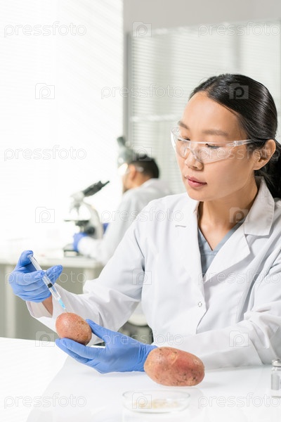 Молодая азиатская исследовательница вводит картофель во время научного эксперимента