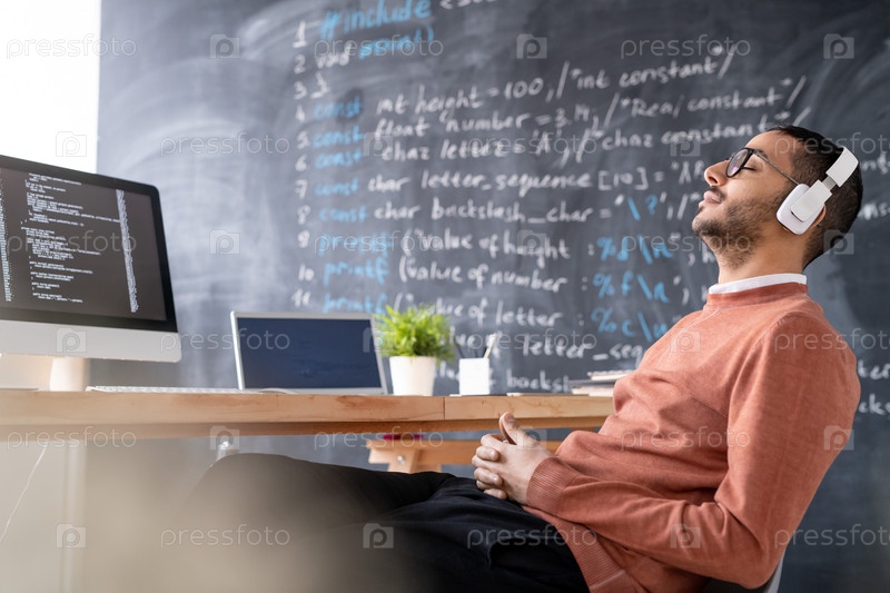 Молодой расслабленный офис-менеджер или программист наслаждаются музыкой в наушниках
