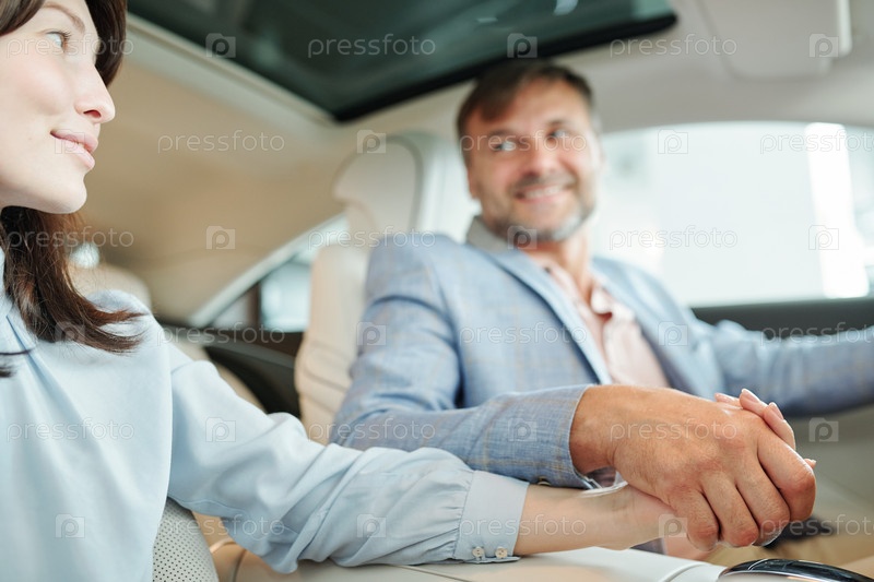 Руки современной ласковой пары средних лет, сидящей на заднем сиденье машины