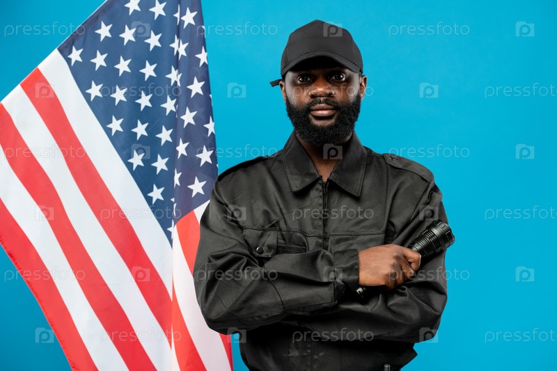 Молодой бородатый охранник африканской этнической принадлежности в черной форме, скрещивающий руки