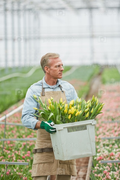 Зрелый рабочий, несущий свежие тюльпаны