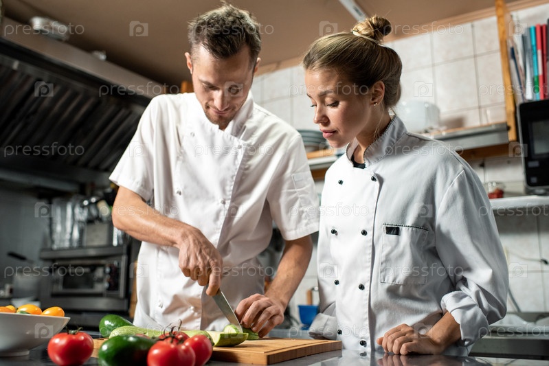 Молодой профессиональный шеф-повар с ножом показывает своему ученику, как готовить цуккини