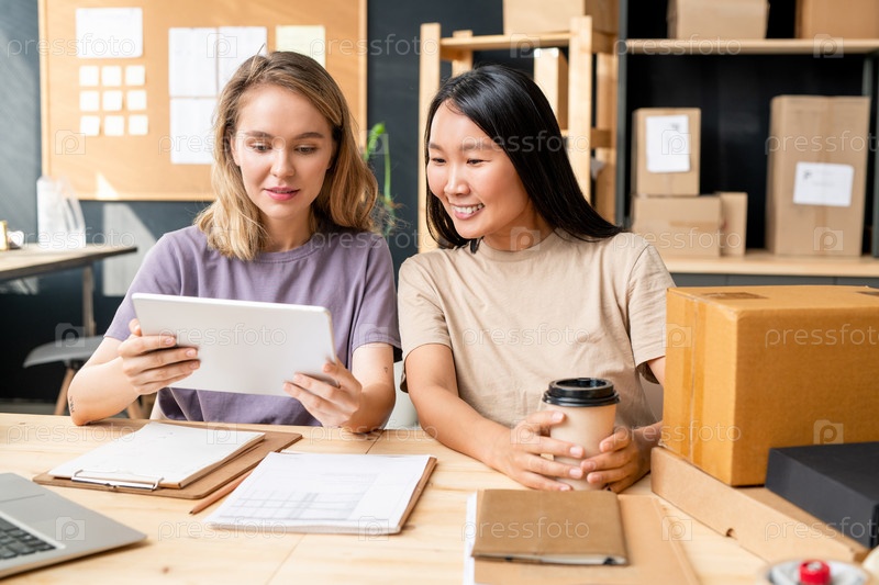 Счастливая молодая азиатская женщина с кофе сидит рядом с коллегой с планшетом