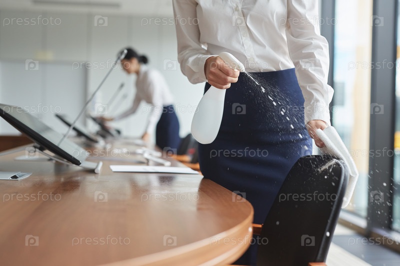 Женская помощница по дезинфекции конференц-зала