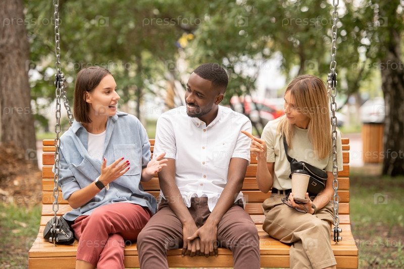 Счастливый молодой африканский мужчина сидит на деревянном качелях между двумя спорящими девушками