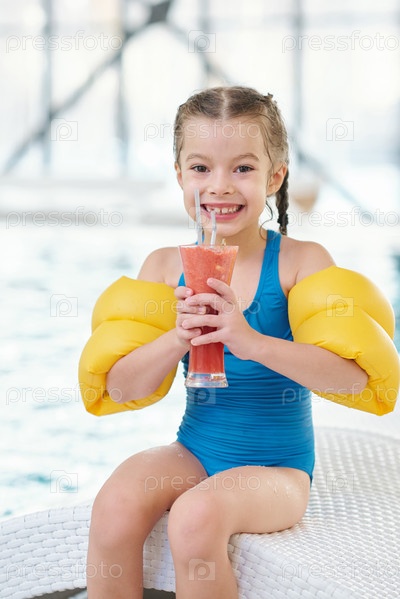 Веселая милая маленькая девочка в купальнике, держащая бокал коктейля после плавания
