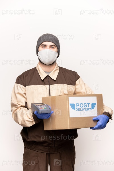 Молодой мужской почтовый курьер в рабочей одежде и маске, держащий ящик-маску и платежный терминал