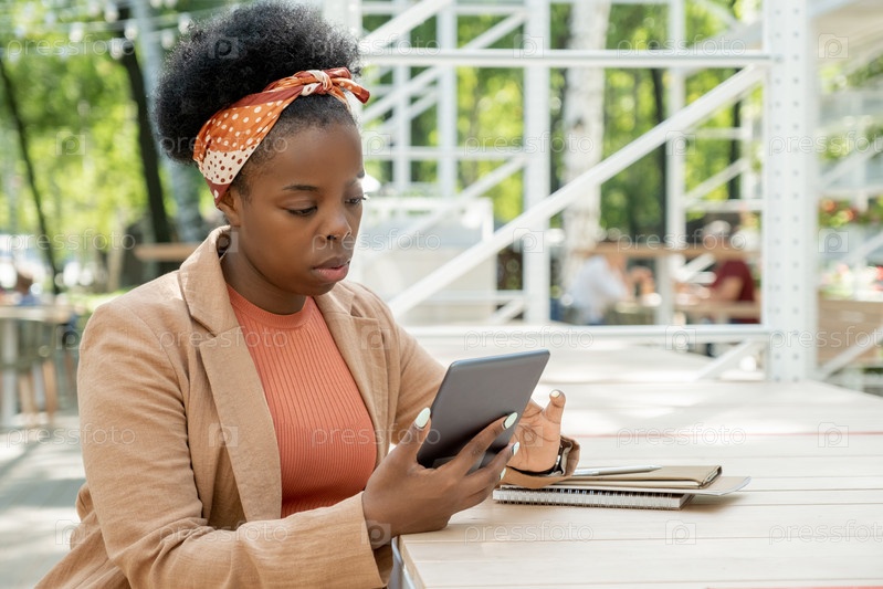 Молодая элегантная бизнесвумен африканской этнической принадлежности прокручивает в мобильном гаджете