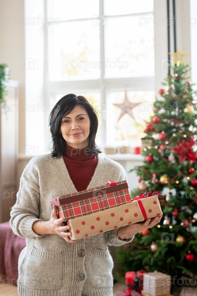Счастливая зрелая брюнетка женщина в повседневной одежде, держащая подарочные коробки с подарками