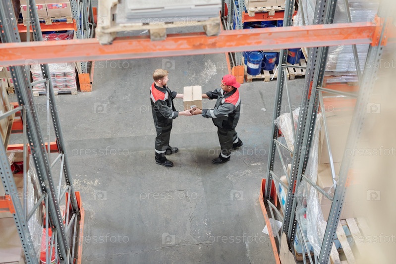 Обзор молодого работника складского зала, передающего упакованную коробку своему коллеге