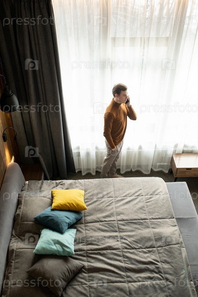Молодой современный мужчина со смартфоном в ухе между кроватью и окном