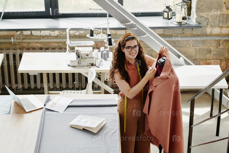 Красивый модный дизайнер работает над новой сезонной коллекцией пальто в студии