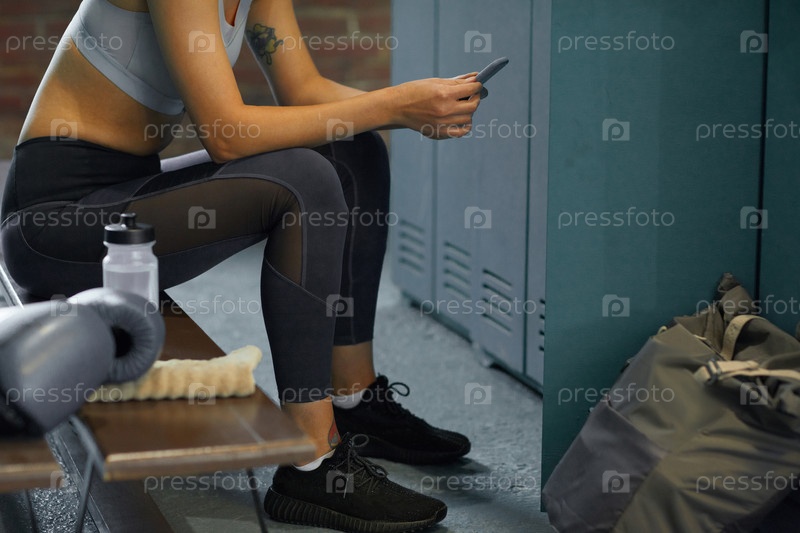 Непризнанная женщина со смартфоном в раздевалке тренажерного зала