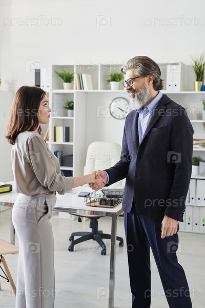 Успешный психолог пожимает руку молодой клиентке после консультации