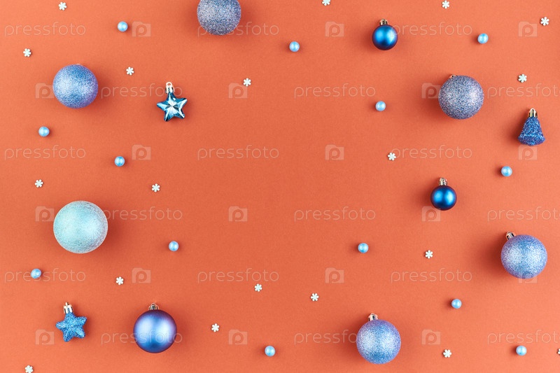 Плоская планировка группы декоративных снежин, синих и серебряных шаров и звезд