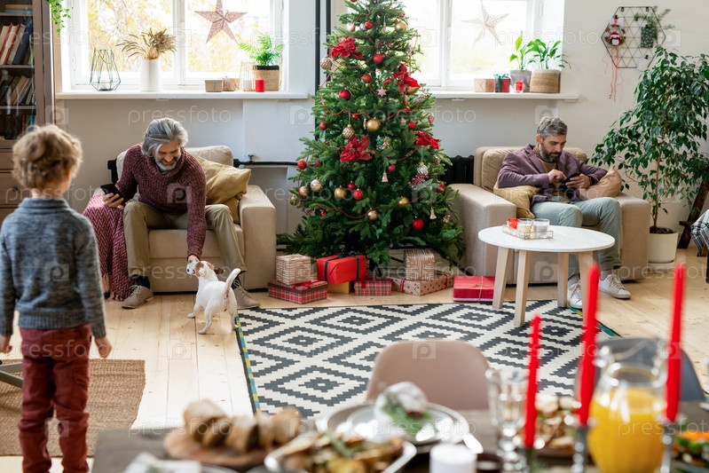 Пожилой мужчина со смартфоном играет с собакой, в то время как его сын использует мобильный гаджет
