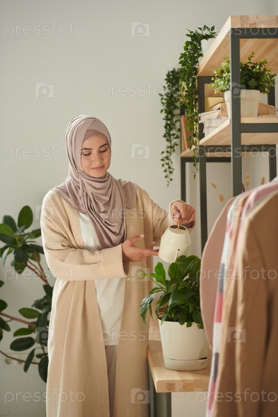 Современная молодая мусульманка, одетая в непринужденный наряд и платок для головы поливные брюки дома, вертикальный средний длинный выстрел