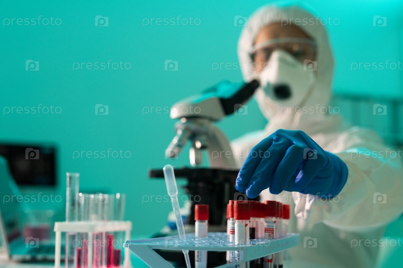Перчатковая рука исследователя в комбинезонах и респираторе, берущего образец крови