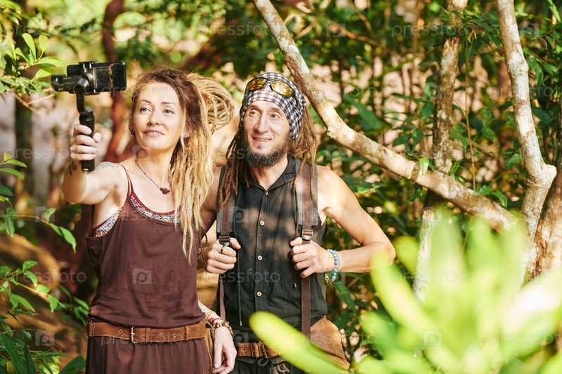 Пешеходы делают селфи в лесу