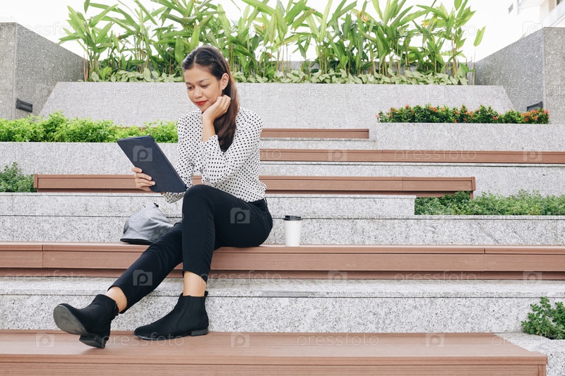 Деловая женщина читает роман на планшете