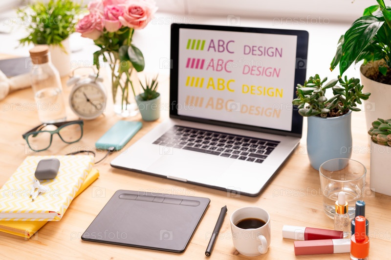 Ноутбук, блокнот, книги, косметические средства, кофе, домашние растения и другие вещи
