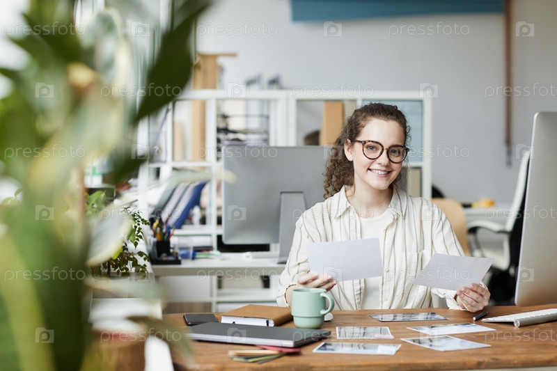 Женщина-редактор на столе в издательском офисе