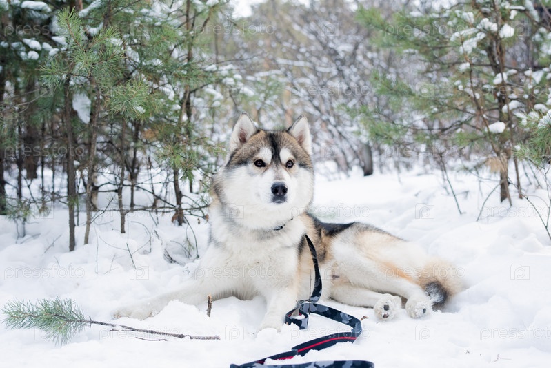 Милая пушистая чистокровная собака сибирский хаски, лежащая на снегу среди деревьев в лесу