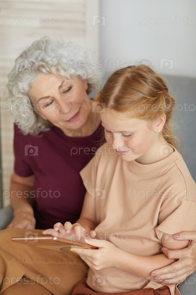 Пожилая женщина использует планшет с девушкой