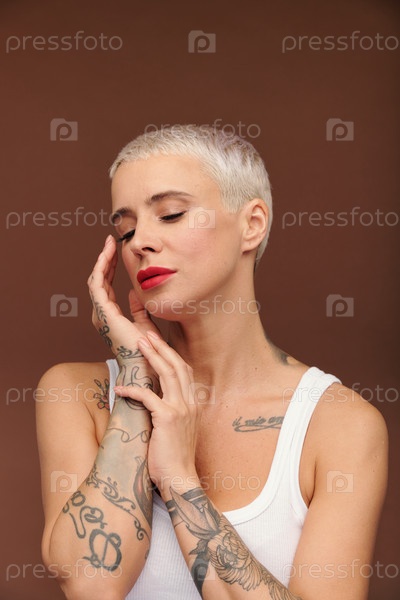 Зрелая блондинка-мужчина с татуировками на руках, касающаяся ее лица рукой