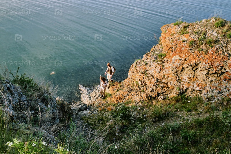 Два молодых рюкзаковщика в повседневной одежде, движущихся по каменной скале на берегу воды