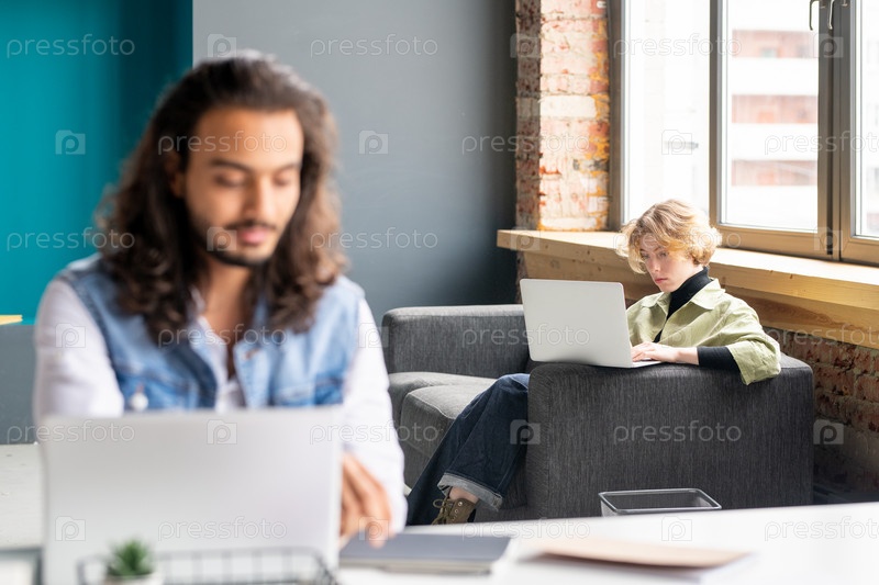 Современная молодая блондинка-бизнесвумен или офисный менеджер общаются на диване