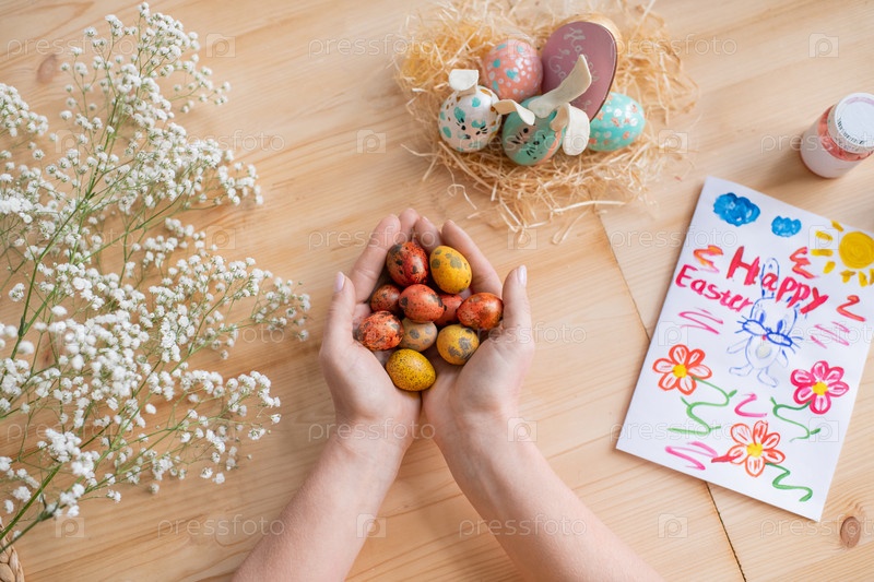 Окрашенные перепелины, держащие яйца