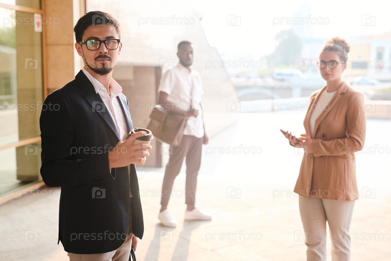 Молодой уверенный бизнесмен в очках и формальной одежде, держащий стакан кофе