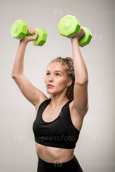 Активная блондинка в черной спортивной одежде, держащая зеленые гантели над головой