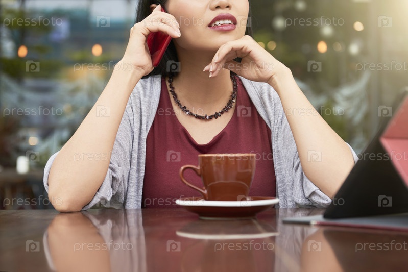 Женщина разговаривает по телефону в кафетерии