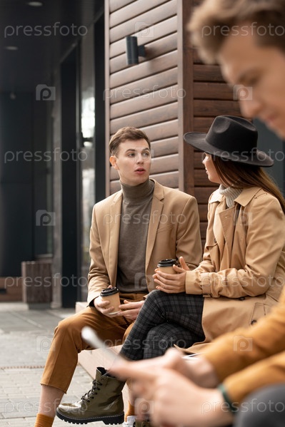 Спокойная девушка с выпивкой смотрит на своего парня, пока оба сидят на скамейке