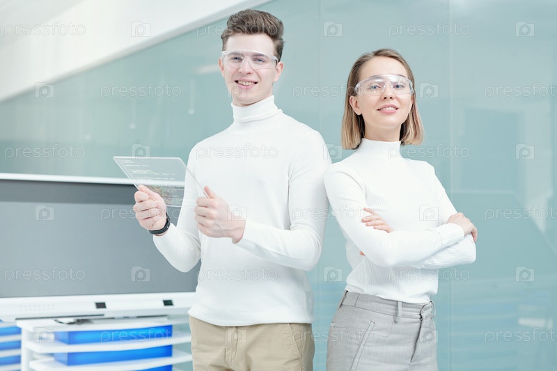 Два юных улыбающихся программиста в умной повседневной одежде и очках смотрят на вас
