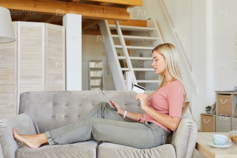 Женщина, использующая планшетный компьютер дома